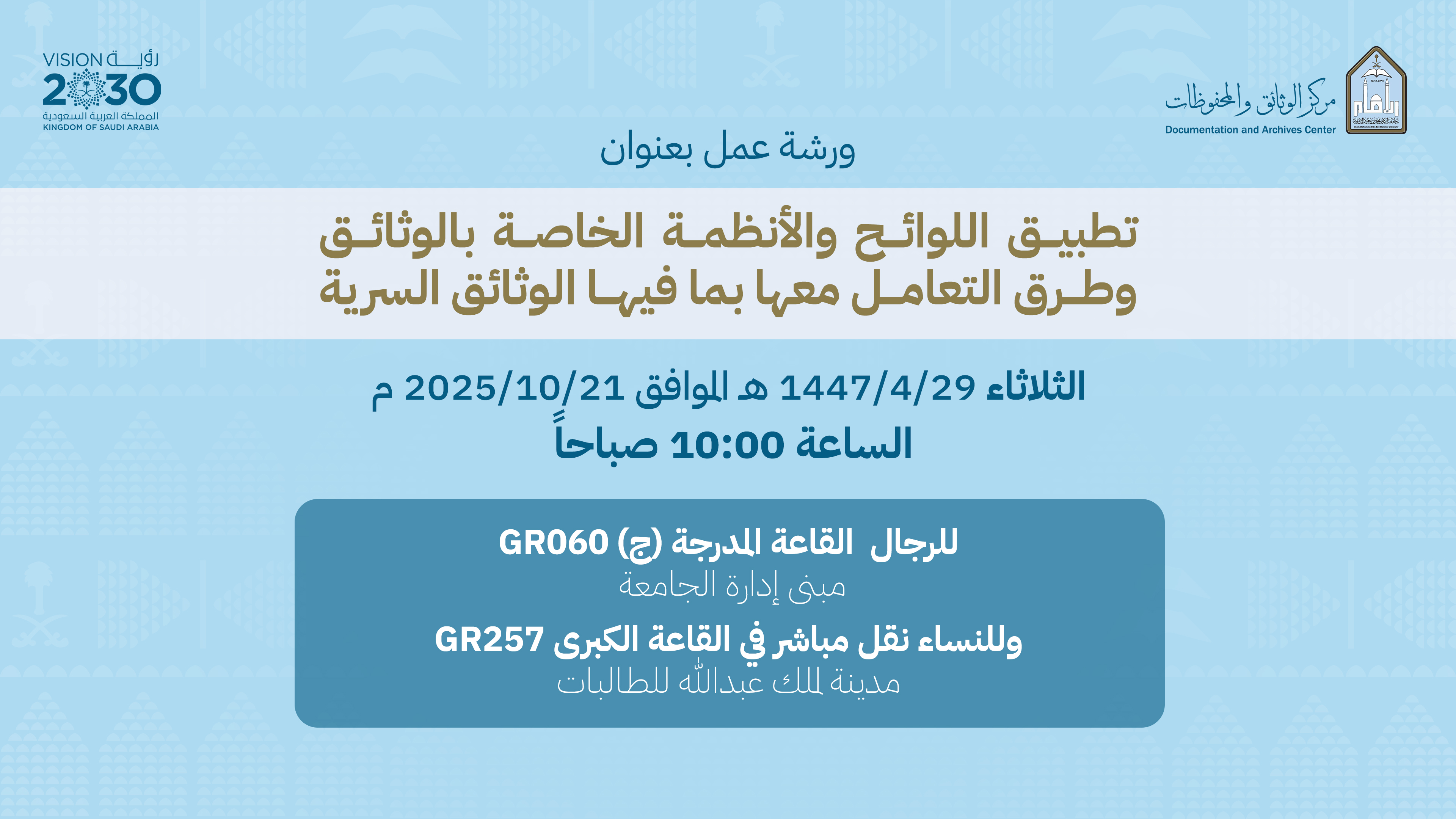 ورشة عمل بعنوان تطبيق اللوائح والأنظمة الخاصة بالوثائق وطرق التعامل معها بما فيها الوثائق السرية