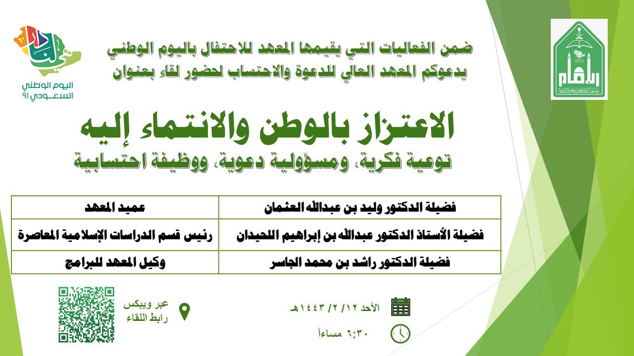 لقاء وطني بعنوان "الاعتزاز بالوطن والانتماء إليه: مسؤولية دعوية، ووظيفة احتسابيه، وتوعية فكرية" يشارك في هذا اللقاء