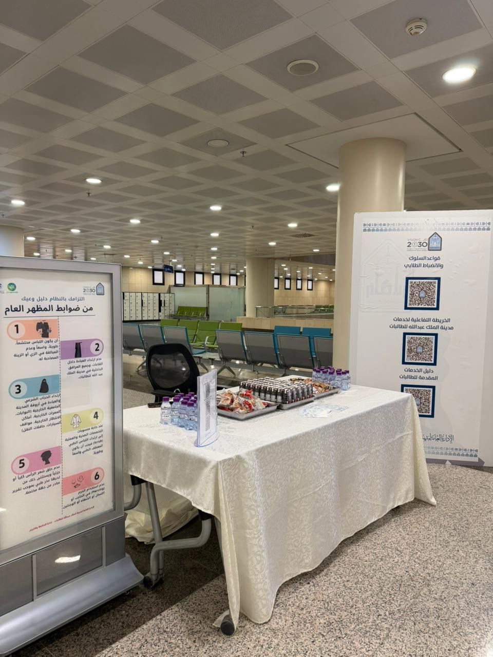 Imam Mohammad Ibn Saud Islamic University (IMSIU), represented by the General Administration of King Abdullah City for Female Students, organized informational booths to introduce university regulations for freshman female students during the second semester, as part of the welcoming programs at the beginning of the academic term.