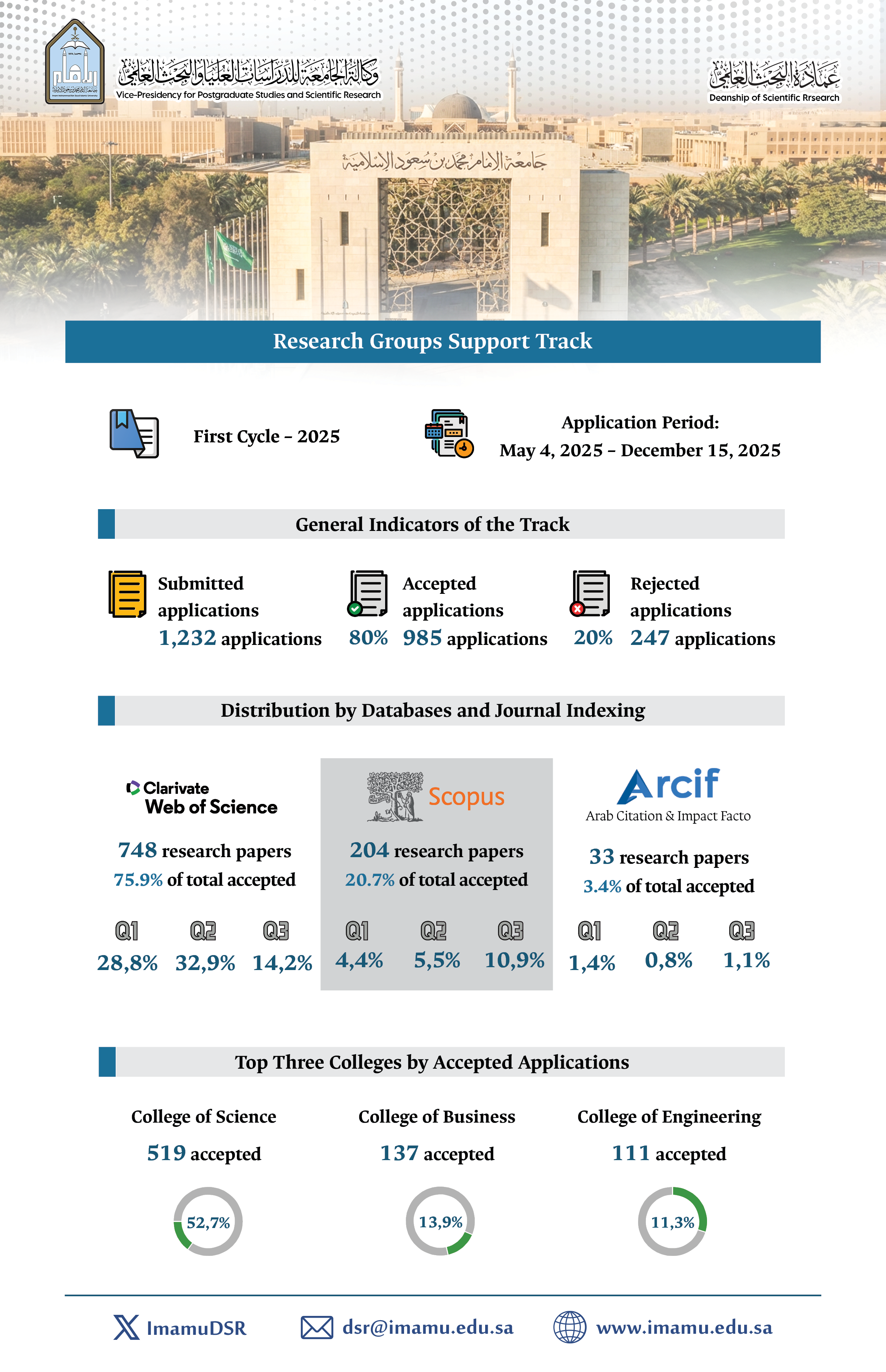 The Deanship of Scientific Research at IMSIU has announced the results of the High-Impact Journal Publication Support Track for its first edition of 2025. The track represents one of the core components of the University's research funding framework and aims to enhance the quality of scholarly publishing while maximizing the University's research impact and international ranking performance. This is achieved by linking financial support to verified research outputs published in globally indexed databases.