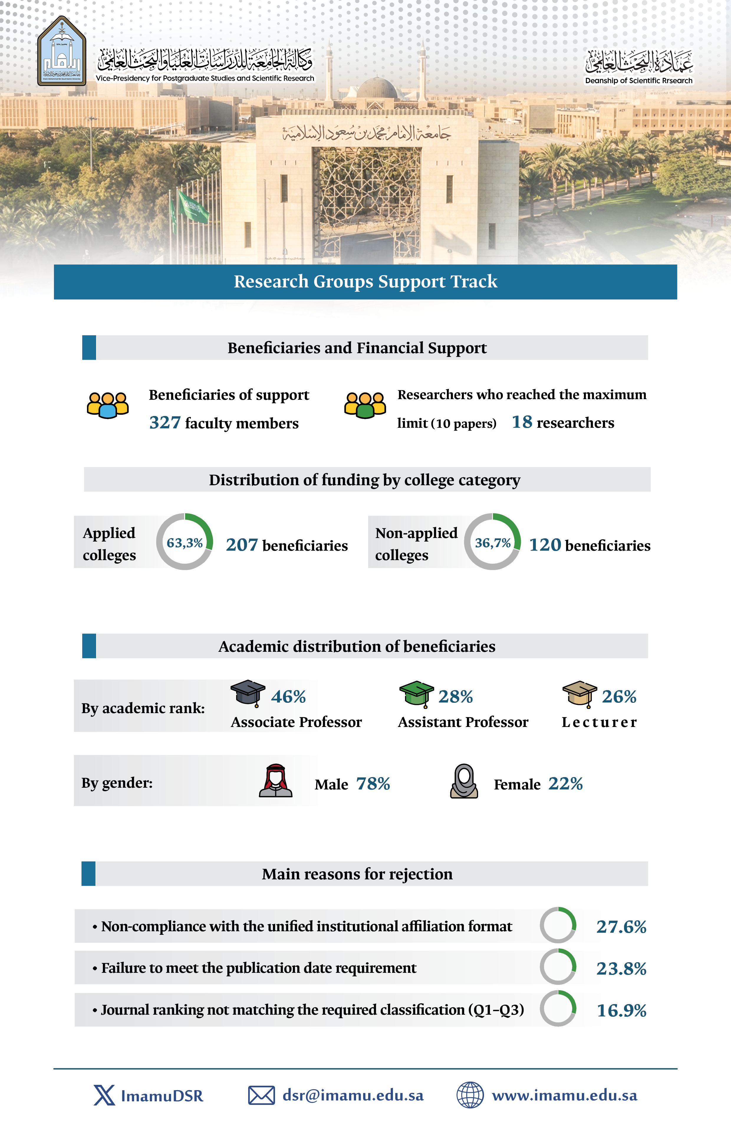 During the application period, which extended from May 4 to December 15, 2025, the Deanship received 2,783 applications. A total of 2,255 applications were approved, reflecting an 81% acceptance rate, while 528 applications (19%) were rejected. The total number of beneficiaries reached 2,255 researchers.