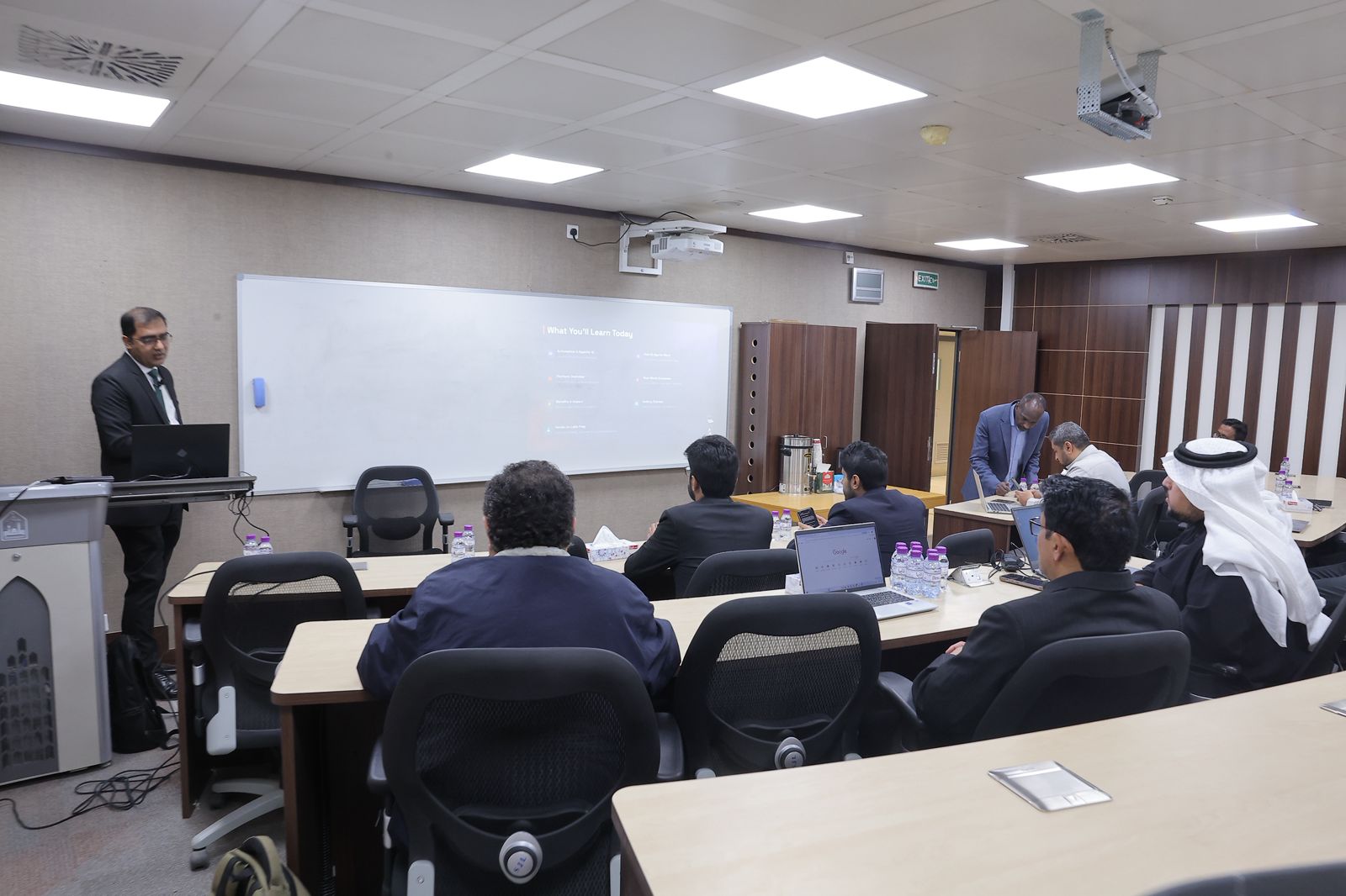 Participants received training on building automated invoice-processing systems using Optical Character Recognition (OCR), in addition to exploring applications for automating social media operations and artificial intelligence–powered appointment scheduling systems. The workshop emphasized identifying high-impact use cases for intelligent technologies within institutions and expanding their adoption without advanced programming expertise.