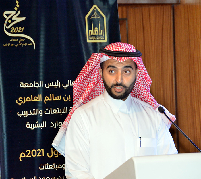 رعى معالي رئيس جامعة الإمام محمد بن سعود الإسلامية الأستاذ الدكتور أحمد بن سالم العامري بعد ظهر اليوم الأربعاء 16/6/1443هـ ، حفل تخرج مبتعثي ومبتعثات الجامعة الحاصلين على درجات الماجستير والدكتوراه والزمالة الطبية لعام 2021م والذي أقامته وكالة الابتعاث والتدريب في عمادة الموارد البشرية في قاعة الشيخ عبدالعزيز التويجري للرجال والقاعة المساندة (ب) للنساء بمبنى المؤتمرات بالجامعة.