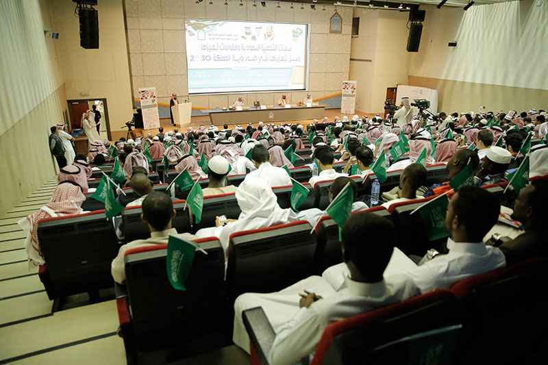 نظمت كلية اللغة العربية بالاشتراك مع معهد تعليم اللغة العربية برنامجاً للاحتفاء باليوم الوطني المجيد ضمن برنامج الجامعة للاحتفاء بالمناسبة الغالية، وكان بعنوان (الاحتفال باليوم الوطني 87)، اشتمل على جملة من المناشط والفعاليات، وحلت في طليعته ندوة "سمات الشخصية السعودية ومقومات تميزها في ضوء رؤية المملكة 2030"، التي عقدت في صباح يوم الأربعاء 7/1/1439هـ، بالقاعة الكبرى بالكلية، وشارك فيها كل من سعادة عميد الدراسات العليا الدكتور بدر بن ناصر الجبر نيابة عن سعادة وكيل الجامعة للدراسات العليا والبحث العلمي الدكتور محمود بن سليمان آل محمود، وفضيلة عميد مركز دراسة الطالبات الدكتور عمر بن عبدالرحمن العمر، وسعادة عميد معهد تعليم اللغة العربية الدكتور بدر بن علي العبدالقادر ، وأدارها سعادة عميد كلية اللغة العربية الدكتور عبدالعزيز بن محمد الحربي، والذي افتتحها بالحديث عن ذكرى اليوم الوطني، وما يثيره في الإنسان من معاني المجد والعزة والمثابرة والكفاح، وبيّن أن الشخصية السعودية تنطلق وتستمد تكوينها من أساس متين وتعاليم ربانية تنشأ على تعاليم الدين الإسلامي وتوجيهات السنة النبوية والسمع والطاعة لولاة الأمر وعدم الخروج، ثم تحدث فضيلة الدكتور عمر العمر عن أثر المحافظة على الأمن وأن ذلك عقيدة يؤمن بها الإنسان لحفظ الدين والدنيا، وعلينا أن نستذكر النعمة الجليلة التي أُسبغت على وطننا الغالي -بلاد التوحيد، وبلاد الحرمين وقبلة المسلمين ومهوى أفئدتهم المملكة العربية السعودية- في عصرنا هذا، عقب ذلك تحدث الدكتور بدر الجبر قائلاً: إن الشخصية السعودية شخصية محافظة على توسطها واعتدالها الذي ينعكس على سلوكها القويم، وأن ذلك مما ينبغي على الشباب السعودي أن يحافظ على هذه السمات الأساسية لتنعكس على شخصياتهم في المستقبل، وأن في القرآن الكريم وسنة الرسول صلى الله عليه وسلم وصحابته الكرام، وفي التراث العربي الأصيل ما يستطيع أن يستمد منه الشباب مكارم الأخلاق والقيم المعتدلة التي تخدمهم في دينهم ودنياهم، أما الدكتور بدر العبدالقادر فذكر بأن سمات الشخصية السعودية تستمد من نهج قادة الدولة الذين أسسوا معاني الاعتدال في تعاملاتهم حيث تبنت القيادة السعودية منهج الاعتدال في كافة شؤونها منذ بزوغ فجر الدولة السعودية الأولى, وهذا ما أكده لاحقاً القائد المؤسس الملك عبد العزيز ـــ رحمه الله ـــ الذي رسم ملامح هذا المنهج وسطَّر صوراً عديدة له منذ أن وحَّد هذه البلاد وجمع شتات شملها تحت راية التوحيد، وأن النهج المعتدل لقادة هذه الدولة المباركة أسلوب حكيم مستمد من الشريعة السمحة.