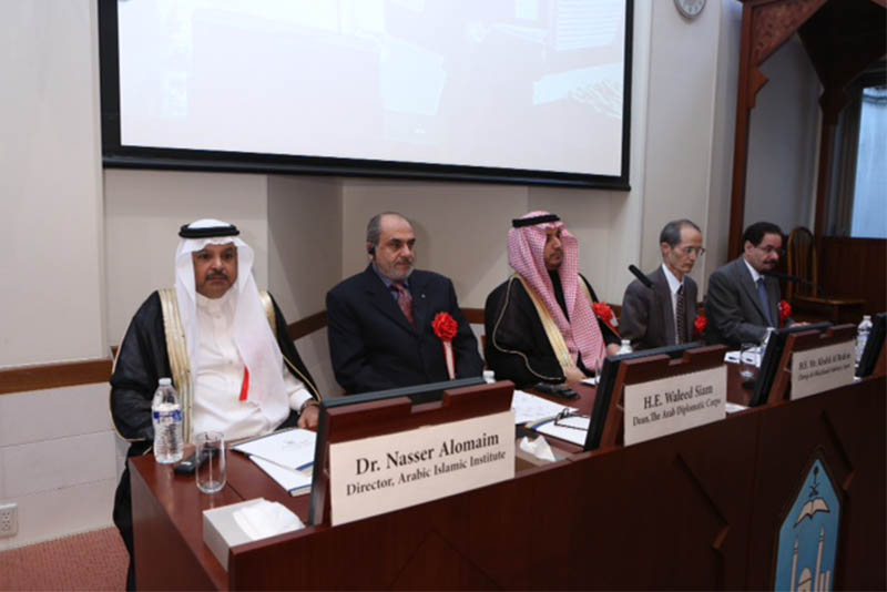 واستعرض في كلمة ألقاها مدير المعهد العربي الإسلامي في اليابان الدكتور ناصر بن محمد العميم جهود المملكة العربية السعودية في نشر اللغة العربية وثقافتها في العالم من خلال مؤسساتها المختلفة ومن أهم هذه المؤسسات جامعة الإمام محمد بن سعود الإسلامية والتي يتبع إليها المعهد.