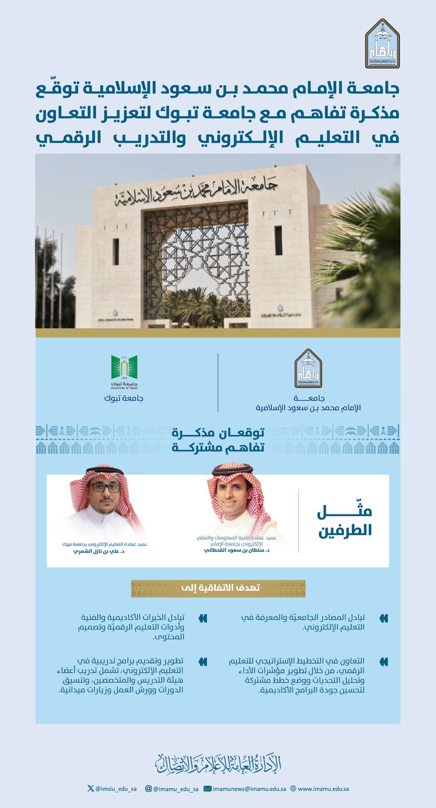 وقد مثّل جامعة الإمام محمد بن سعود الإسلامية في توقيع الاتفاقية عميد عمادة تقنية المعلومات والتعلم الإلكتروني د. سلطان بن سعود القحطاني، فيما مثّل جامعة تبوك عميد عمادة التعليم الإلكتروني د. علي بن نازل الشمري.