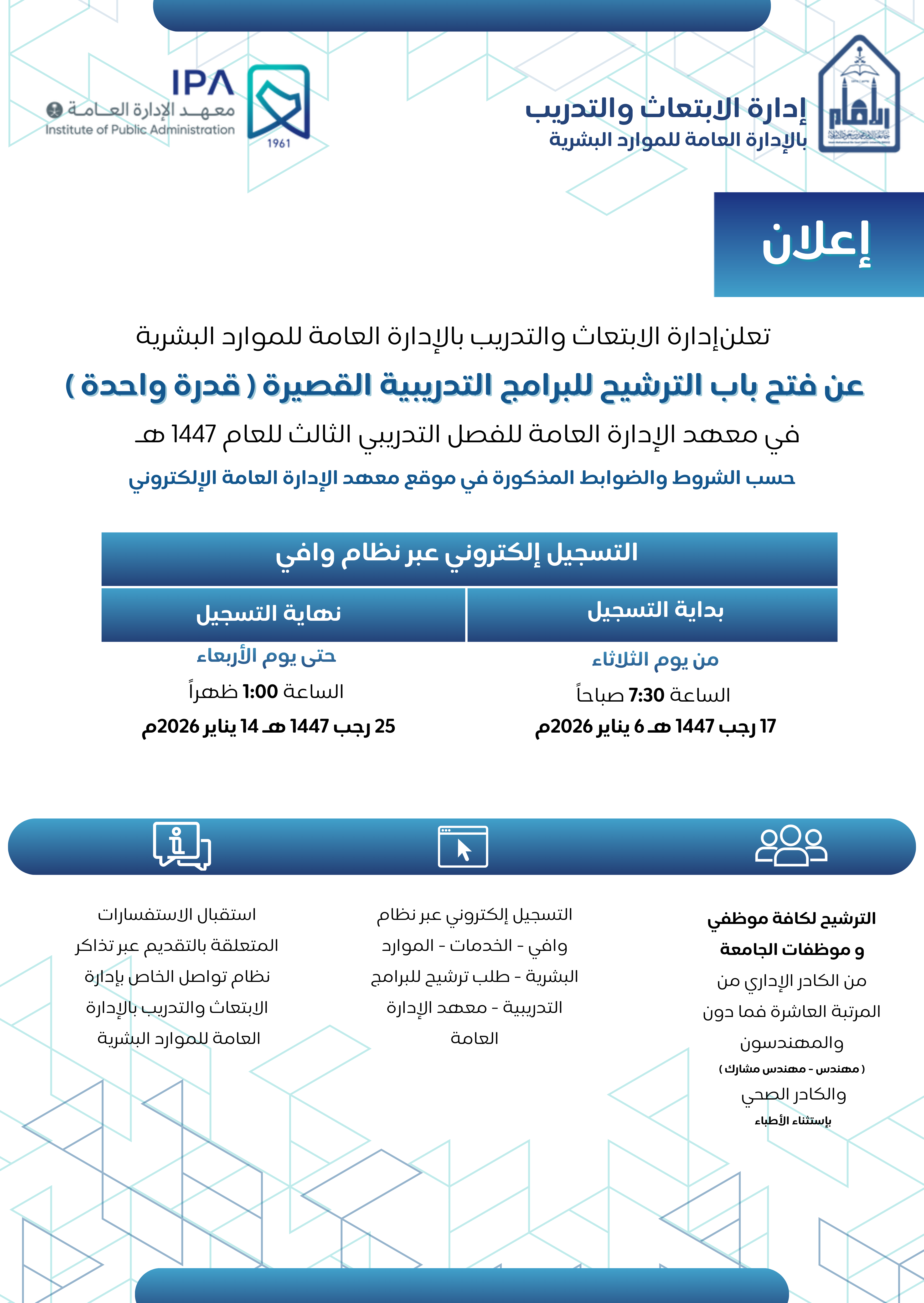 تعلن عن فتح ﺑﺎب اﻟﺘﺮﺷﻴﺢ ﻟﻠﺒﺮاﻣﺞ اﻟﺘﺪرﻳﺒﻴﺔ اﻟﻘﺼﻴﺮة ( ﻗﺪرة واﺣﺪة ) للفصل التدريبي الثالث للعام 1447هـ
